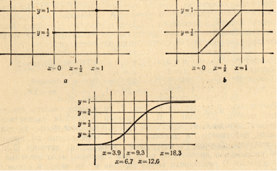 На рис. 1 представлены три примера. Первый, – функция распределения случайного бита, т. е. случайной величины ξ, принимающей значения 0 или 1, каждое с вероятностью 12. На 1, b – функция распределения вещественной случайной величины, равномерно распределенной между нулем и единицей, так что вероятность того, что ξ≤x, просто равна x, если 0≤x≤1. Рисунок 1, c показывает предельное распределение значений V в критерии χ2. Заметим, что F(x) всегда возрастает от 0 до 1 при увеличении x от -∞ до +∞.