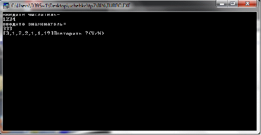 Делим числитель на знаменатель, запоминаем его целое значение (a div b, где а – числитель, b - знаменатель), находим остаток от деления числителя на знаменатель (a mod b), присваиваем числителю значение остатка, меняем местами числитель и знаменатель, и так делаем до тех пор, пока (a mod b) не станет равен нулю.