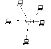 звездная (star) - имеется центральный узел, от которого расходятся линии передачи данных к каждому из остальных узлов;