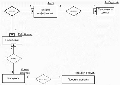 - степень связи 1:1, потому что каждый оклад, который соответствует определенному разряду, может иметь только один определенный процент премии соответственно по тому же разряду;