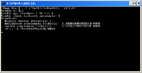 Як результат роботи видати: обчислене наближене значення функції, кількість кроків ітерації, обчислене за формулою значення функції, абсолютну різницю наближеного і "точного" значень функції.