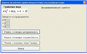 - решение квадратного уравнения с помощью таблицы Горнера;