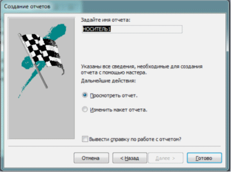Создаю отчет по таблице носитель. Выбираю таблицу носитель и из доступных полей перекидываю данные в выборочные поля, нажимаю далее