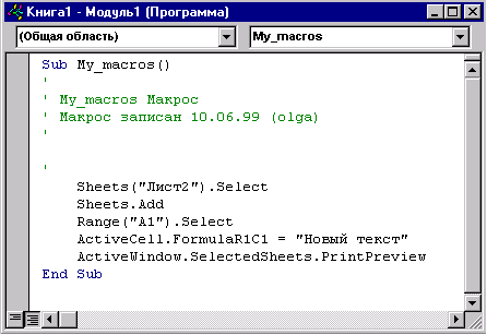 Описанным выше способом Вы можете создать достаточно простой макрос. Для автоматизации более сложных задач необходимо знакомство с Visual Basic for Applications (Visual Basic для приложений). Кроме того, встроенный редактор Visual Basic позволяет просматривать и редактировать макросы, созданные без его помощи, т.к. каждый раз когда Вы записываете макрос, он сохраняется в новом модуле Visual Basic, присоединенном к книге. С помощью Visual Basic Вы можете копировать макросы и переименовывать их.