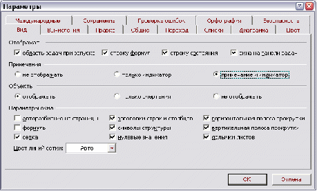 Следует обратить внимание на то, что линии, которые разграничивают ячейки в рабочем листе, приведены для удобства, то есть, если есть необходимость, их можно не отображать. Чтобы спрятать линии сетки в рабочем листе, выполните команду Сервис / Параметры… Дальше щелкните, если нужно, по вкладке Вид и в окне, которое появилось, снимите опцию сетка. Также с помощью поля Цвет: можно изменить цвет сетки.
