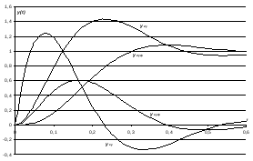 Для системы с минимальным показателем колебательности стоить кривые переходного процесса не будем по причине сложности вывода переходной функции.