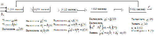 Входные данные поступают на первое ( и ) звено, обратной линией отмечено управление конвейером (когда на первом звене выполняется условие n>0, то на пятом звене оно соответствует условию n-4>0; это условие проверяется на пятом, и сигнал о чтении следующего значения или прекращение чтения поступает на первое звено).