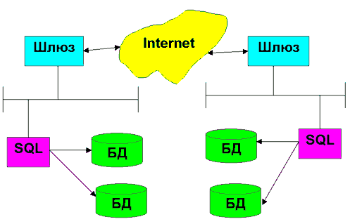Рис 14. Организация доверительных БД -- работа через машину-посредник (шлюз)