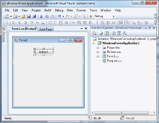 3) Всё готово для начала разработки. Ставим объекты на форму: для того, чтобы это сделать, необходимо выбрать ToolBox и кликнуть по нужному объекту.