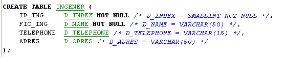 В четвертой таблице «Инженеры» хранится информация о номере инженера, ФИО инженера, содержит телефон и адрес.