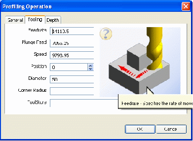Выбрав команду Profiling Operation, указываем на вкладке Tooling (Инструмент) параметры используемого инструмента(фрезы). Задаем диаметр, равный 50 мм. Обработка инструментом такого размера будет довольно грубой, поэтому целесообразно использовать вторичную обработку по контуру. Для этого выберем меньший диаметр фрезы, равный 2 мм.