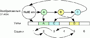 Естественно, что для работы со списком одних только ссылок между элементами недостаточно – надо знать, например, где расположен первый элемент списка, и отличать последний элемент от всех остальных (ведь за ним уже никаких элементов нет). Для этих целей можно было бы ввести две переменные, которые содержали бы индексы начала и конца списка. Мы, однако, этого делать не будем, а воспользуемся приёмом «сворачивания в кольцо» – «свернем» список, введя специальный воображаемый элемент NULL, который всегда будем располагать в элементе с индексом NullElem (имеющим значение 0) массива, используемого для хранения ссылок на элементы списка (назовем его Refs). На рисунке 3 показано графическое представление этой модели.
