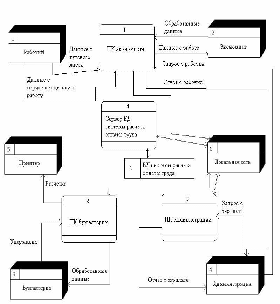 Устанавливаются ссылки между задачами и процессами диаграмм потоков данных следующих уровней. На рис. 10 изображена диаграмма системных процессов, в которой имеется шесть сущностей (рабочие, экономист, бухгалтерия, администрация, принтер, локальная сеть). Также имеется четыре процесса «ПК экономиста», «ПК администрации», «ПК бухгалтерии», «Сервер базы данных системы расчета оплаты труда». При поступлении данных от рабочего, данные сохраняются в базе данных и затем обрабатываются экономистом и бухгалтерии. Затем сумма к выдаче посылается на принтер в виде расчетки и выдается рабочему.
