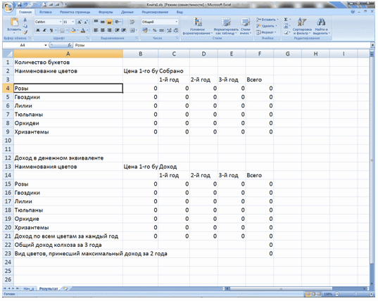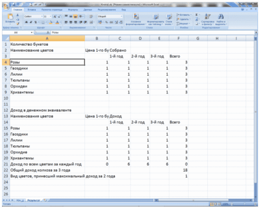 - исходные данные в виде таблицы, где указаны наименования цветов, закупочные цены букетов каждого вида и количество букетов в каждом году;
