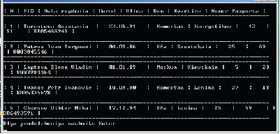 Writeln ('| N | FIO | Data rogdenia | Gorod | Ulica | Dom | Kvartira | Nomer pasporta |');