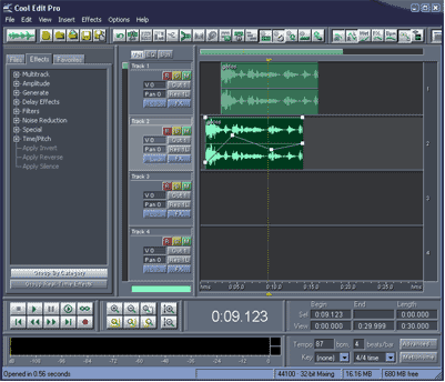 Основные возможности редактора Cool Edit Pro 2.0 (см. Скриншот 1 - пример рабочего окна программы в многодорожечном режиме): редактирование и сведение аудио на 128 дорожках, 45 встроенных DSP-эффектов, включая инструменты для мастеринга, анализа и реставрации аудио, 32-битная обработка, поддержка аудио с параметрами 24 бит / 192 КГц, мощный инструментарии для работы с петлями (loops), поддержка DirectX, а также управление SMPTE/MTC, поддержка работы с видео и MIDI и прочее.