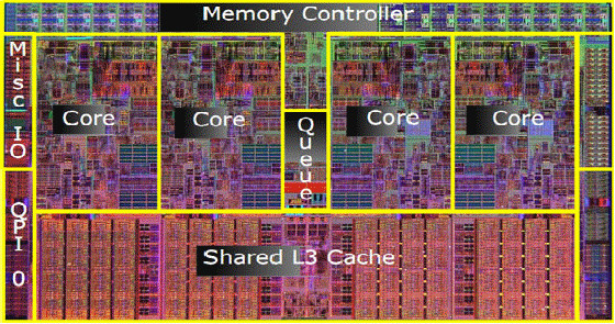 Согласно официальным сведениям первые процессоры Nehalem обладают, по крайней мере, 731 млн. транзисторов, что на 10,7% меньше, чем у «квадов» Penryn Yorkfield. В то же время, площадь кристалла Core i7 увеличена с 214 до 263 мм2, приведён на рисунке 5.