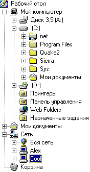 В 32 разрядных операционных системах Windows существует иерархическая файловая структура диска. Структура – организация хранения папок и файлов на диске, обеспечивающая быстрый доступ к ним. Программные средства, обеспечивающие файловые операции называются файловой системой. В Windows для файловых операций имеется специальная программа – Проводник. На рисунке изображено дерево папок. Дерево папок отображает путь к нужной на данный момент папке. В нужную папку можно попасть, последовательно открывая папки нижних уровней. По такому же принципу работает и другая интегрированная программа Windows – Мой компьютер. Но здесь процедура поиска нужной папки или файла занимает больше времени. Кроме данных интегрированных программ на компьютеры отдельно устанавливаются более удобные программы называемые операционными оболочками.