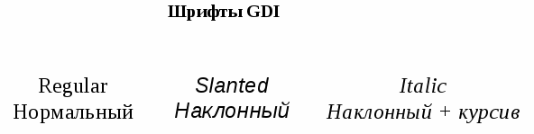 Со шрифтами устройств мы разбираться не будем, так как это очень специфичные шрифты и их свойства жестко определены возможностями аппаратуры. Основное внимание мы сосредоточим на шрифтах GDI.