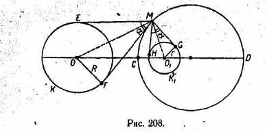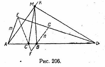 VI. Геометричне місце точок, що їх віддалі від двох прямих АВ і CD відносяться, як m: n, є сукупність двох прямих LK і MN (рис. 204), що проходять через точку Е перетину прямих АВ і CD і через точки К і L, M і N перетину прямих, паралельних АВ і віддалених від неї на ь, з прямими, паралельними CD і віддаленими від неї на n.