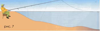 В случаях, когда береговая зона густо заросла водной растительностью или в верхней части бровки располагается коряжник, рыболов вынужден ловить угря на поплавочную удочку, перекидывая наживку через естественные препятствия (рис. 6). При ловле "на захламленном дне или в редком коряжнике поводки крепятся на кронштейнах, позволяющих в отдельных случаях огибать препятствия (рис.7).