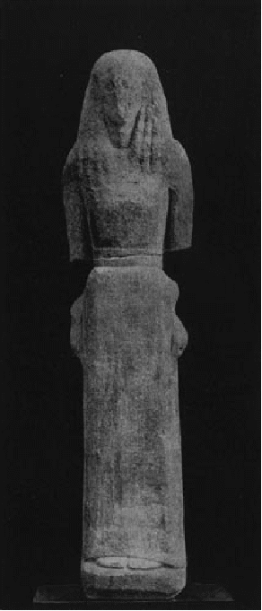 «Артеміда» з острова Делоса (див. додаток А), що датується близько VII ст. до н.е., принесена в дар богині декотрою Нікандрою (як бачимо з напису на статуї), є майже не розчленованим кам'яним блоком із слабо наміченими формами тіла. Художник не зважився висунути жодної частини тіла: груди, живіт, руки – все знаходиться в одній площині. Голова поставлена прямо, волосся симетрично падає на плечі, руки опущені уздовж тіла, ступні ніг здаються механічно приставленими до брилоподібної маси довгого одягу, який зображений абсолютно нерухомо. Ця статуя несе деяке новаторство, оскільки в більш ранні часи не було такого прагнення до пропорційності людської фігури.