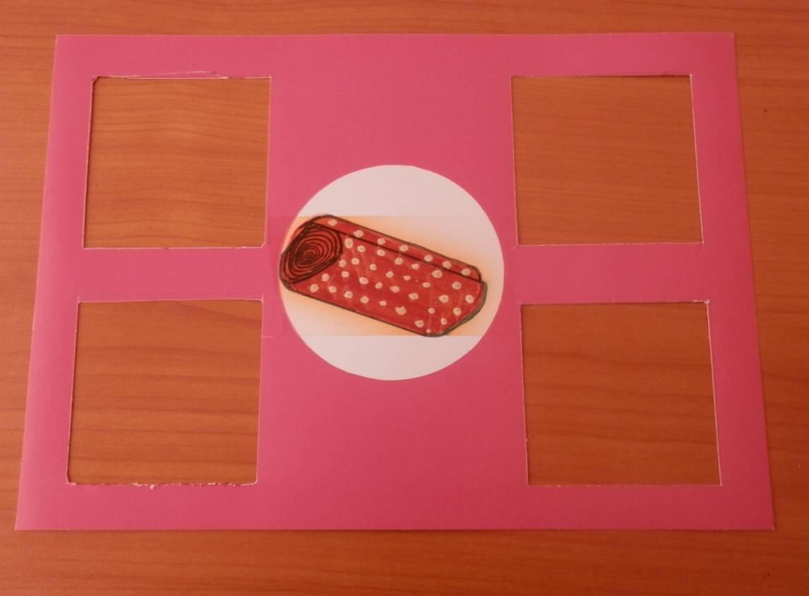 Вокруг этого символа сделаны четыре квадратных прорези. Шестерым участникам игры раздаются эти карточки. Дети накладывают карточки на альбомный лист. Если ребёнку попалась карточка с изображением дерева, то ему нужно нарисовать в прорезях на альбомном листе четыре деревянных изделия. Например: стол, шкаф, доска и скалка.