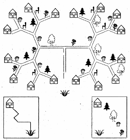 Подобные задания часто встречаются в детских журналах, в рабочих тетрадях для дошколят. Выявляет (и тренирует) уровень наглядно-схематического мышления (умение пользоваться схемами, условными обозначениями), развитие внимания. Несколько вариантов таких лабиринтов мы предлагаем: