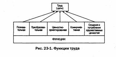 Труд, профессия, специальность. Труд — это целесообразная деятельность по преобразованию окружающего мира для удовлетворения потребностей человека. Труд является одним из основных видов осознанной активности человека, которая служит средством и способом его самореализации в личной и общественной жизни, общения, познания себя и окружающего мира, развития себя как личности, самоутверждения, создания материальных и духовных ценностей и личного достатка. Достижение указанных целей труда обеспечивается следующими его функциями (рис. 23-1):
