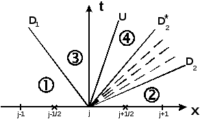 , если сетка подвижна). Трудность состоит в том, что необходимо определять, в какой именно из секторов, образуемых конфигурацией распада разрыва, он попадает. Очевидно, что нет необходимости рассчитывать эту конфигурацию полностью. Например, если U<0, нет необходимости рассчитывать «левые» величины и, наоборот, если U>0 – «правые».